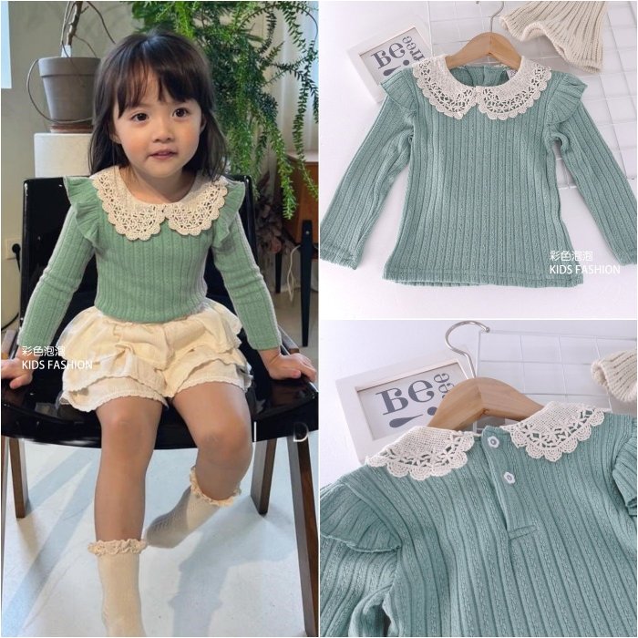 優寶購物《ubao.Tw》特貨品商城,黑貓宅配,取貨付款,○。° 彩色泡泡 °。○ 童裝【貨號F31550】秋冬。蕾絲翻領綠色針織T | Yahoo拍賣