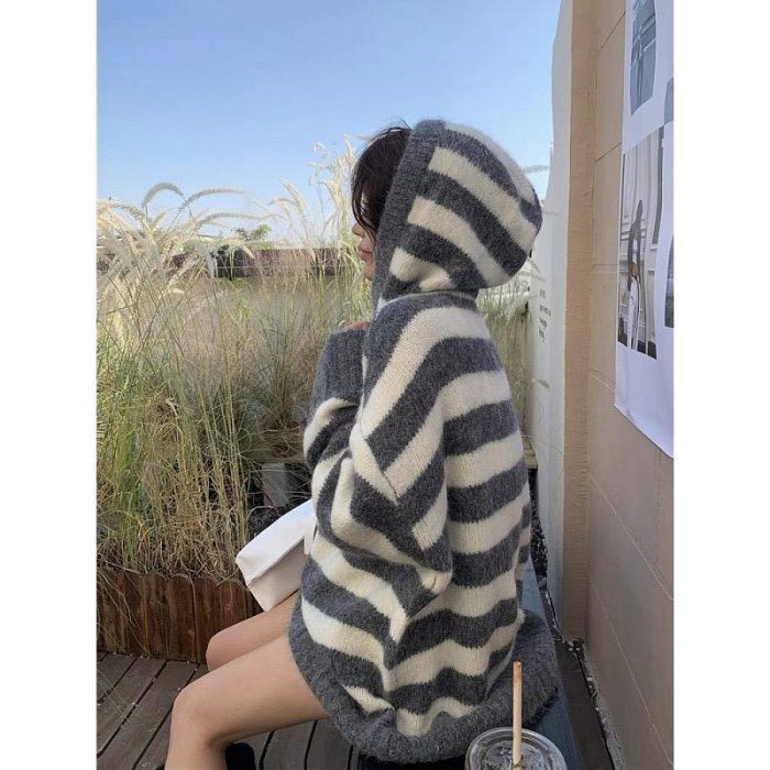 優寶購物《ubao.Tw》特貨品商城,黑貓宅配,取貨付款,[ ohya梨花 ] =韓國帶回=最新秋冬甜酷千金俏皮時髦精灰色條紋連帽造型罩衫毛衣 | Yahoo拍賣
