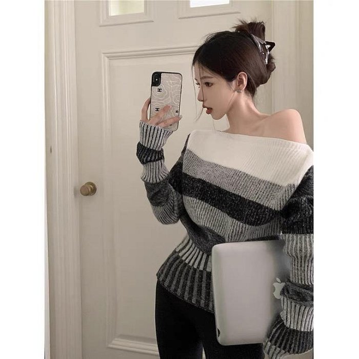 優寶購物《ubao.Tw》特貨品商城,黑貓宅配,取貨付款,[ ohya梨花 ]=韓國帶回=最新秋冬新款性感慵懶辣妹高級感黑白條紋露肩造型上衣罩衫毛衣 | Yahoo拍賣