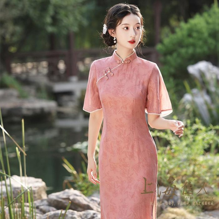 優寶購物《ubao.Tw》特貨品商城,黑貓宅配,取貨付款,新款改良版旗袍 經典復古中國風氣質雪紡提花開衩修身中長款 傳統旗袍 寬袖年輕款連衣裙 /2266/粉色/上海佳人平價旗袍唐裝 | Yahoo拍賣
