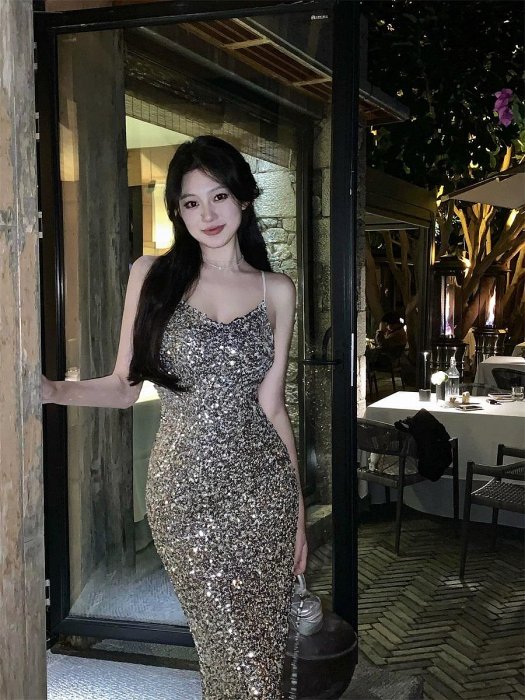 優寶購物《ubao.Tw》特貨品商城,黑貓宅配,取貨付款,迷人復古風 耀眼氣勢感 細肩帶低胸V領 漸層亮片金色晚禮服 長禮服 亮片洋裝 婚禮 晚宴服 夜店洋裝 | Yahoo拍賣
