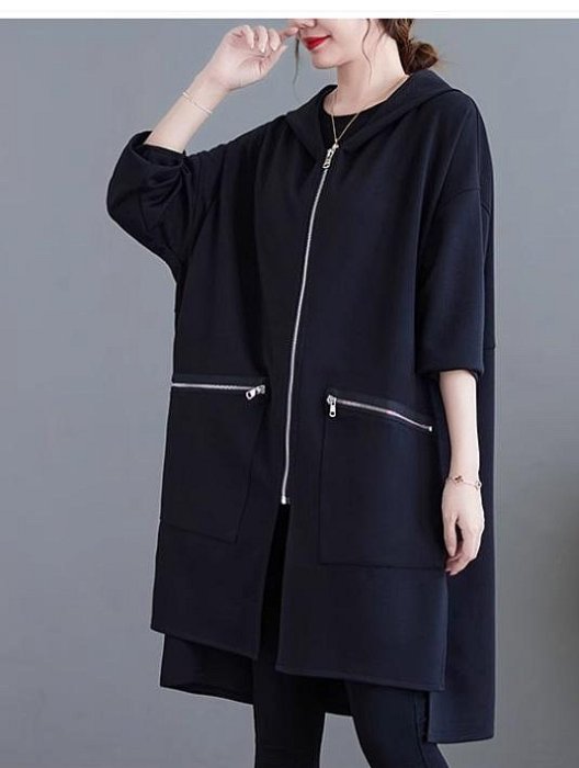 優寶購物《ubao.Tw》特貨品商城,黑貓宅配,取貨付款,女人衣櫥㊕秋裝換季簡約清新出門輕鬆搭 對稱腰間拉鍊口袋前短後長 黑色下擺側開連帽長袖中長風衣外套 胖MM大尺碼超大胸136-144.S701♥ | Yahoo拍賣