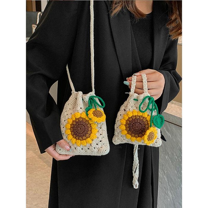 優寶購物《ubao.Tw》特貨品商城,黑貓宅配,取貨付款,現貨 針織包 針織田園手工編織毛線包包成品向日葵可愛斜挎抽繩水桶包潮 | Yahoo拍賣