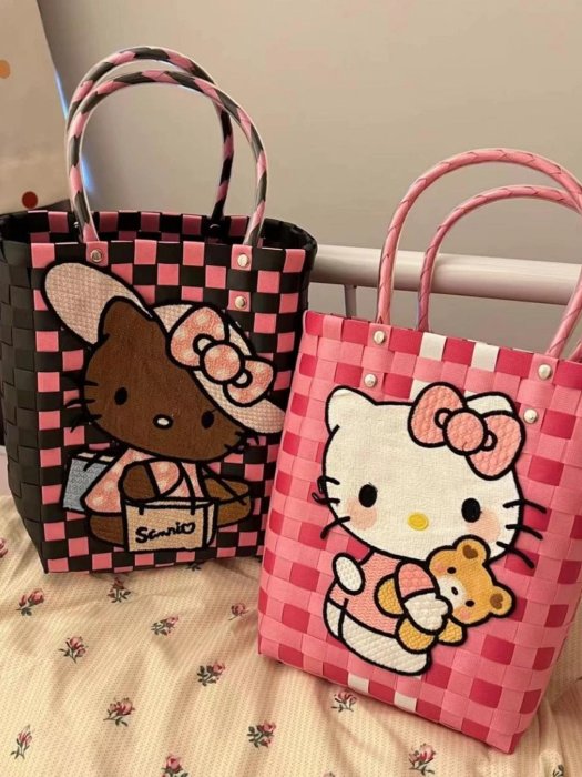 優寶購物《ubao.Tw》特貨品商城,黑貓宅配,取貨付款,現貨 編織包 HelloKitty編織菜籃子包包女大容量kt貓沙灘手提包可愛黑皮Kitty | Yahoo拍賣