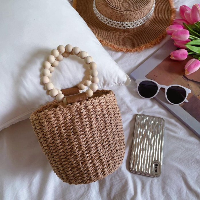 優寶購物《ubao.Tw》特貨品商城,黑貓宅配,取貨付款,現貨 編織包 串珠手提草編包手工編織包圓形抽袋小清新休閑海邊沙灘提手水桶包 | Yahoo拍賣