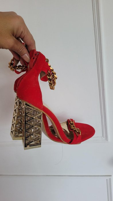 優寶購物《ubao.Tw》特貨品商城,黑貓宅配,取貨付款,皇家國標舞鞋 紅色高跟鞋,搭配金色鏈節裝飾,尺寸 8.5 女用粗高跟鞋12cm | Yahoo拍賣