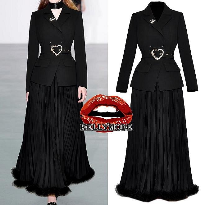 優寶購物《ubao.Tw》特貨品商城,黑貓宅配,取貨付款,♥kellymode♥全新24早秋新款 氣質優雅 小香風 黑色翻領 愛心腰帶 長袖西裝外套+百摺裙擺皮草毛毛加工 半身長裙 套裝 | Yahoo拍賣