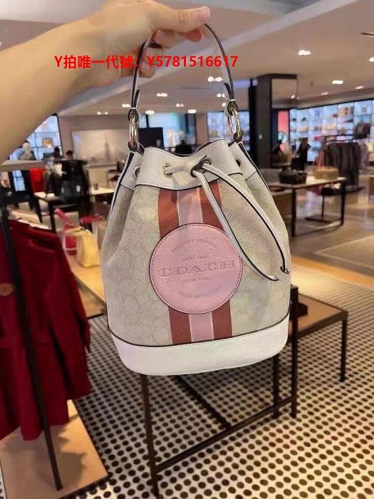 優寶購物《ubao.Tw》特貨品商城,黑貓宅配,取貨付款,代購COACH C4102 新款女士Dempsey抽繩水桶包 條紋拼大logo單肩斜揹包 附購證 | Yahoo拍賣