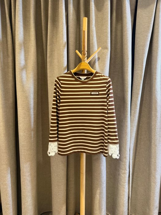 優寶購物《ubao.Tw》特貨品商城,黑貓宅配,取貨付款,設計師品牌巧克力色橫條紋布蕾袖美衣 | Yahoo拍賣