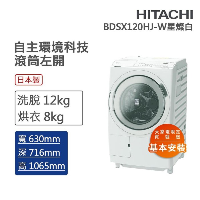 優寶購物《ubao.Tw》特貨品商城,黑貓宅配,取貨付款,[ 雙1212家電折扣破盤價 ] HITACHI日立12KG日製變頻左開滾筒洗脫烘洗衣機 BDSX120HJ-W 全省配送安裝 線上刷卡免手續 | Yahoo拍賣