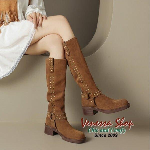 優寶購物《ubao.Tw》特貨品商城,黑貓宅配,取貨付款,小V私家~ 個性鉚釘真皮長靴 DH 顯瘦顯腿長 女の磨砂牛皮長筒靴 中跟粗跟騎士靴 馬丁靴 5CM 2色 (W1224) | Yahoo拍賣