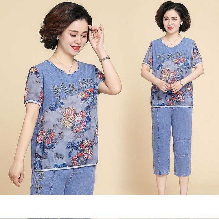 優寶購物《ubao.Tw》特貨品商城,黑貓宅配,取貨付款,【締造】中老年牛仔套裝女夏2021新款洋氣上衣年輕媽媽夏裝短袖T恤兩件套 | Yahoo拍賣