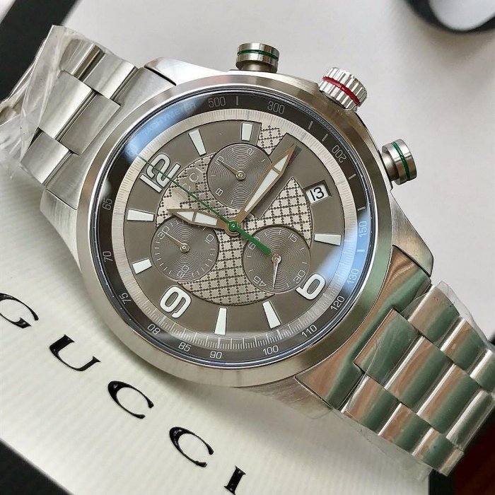 優寶購物《ubao.Tw》特貨品商城,黑貓宅配,取貨付款,GUCCI G-Timeless 灰褐色錶盤 銀色不鏽鋼錶帶 石英 三眼計時 男士手錶 YA126248 | Yahoo拍賣
