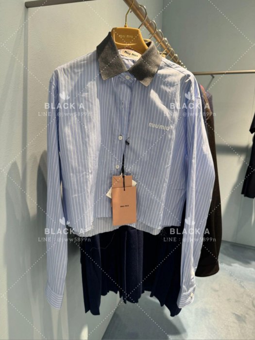 優寶購物《ubao.Tw》特貨品商城,黑貓宅配,取貨付款,【BLACK A】MIU MIU 24FW 灰色領子拼接短版藍白條紋襯衫 價格私訊 | Yahoo拍賣
