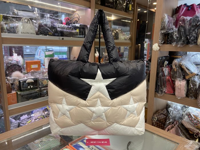 優寶購物《ubao.Tw》特貨品商城,黑貓宅配,取貨付款,☆最愛二手精品☆ MIU MIU 黑白卡其色三色尼龍星星圖手提包肩背包空氣包購物包 5BG240 C2030 | Yahoo拍賣