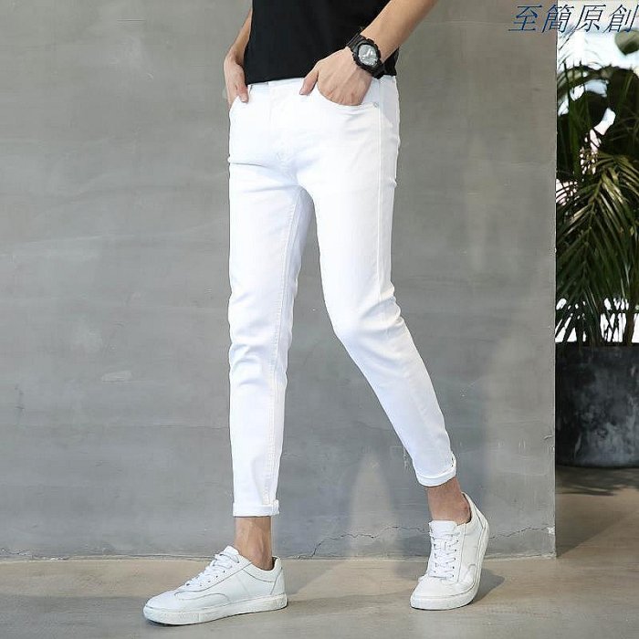 優寶購物《ubao.Tw》特貨品商城,黑貓宅配,取貨付款,高品質】品質白色牛仔褲春季牛仔白色九分褲男青少年時尚休閒長褲潮流款彈力修身小脚褲男-至簡原創 | Yahoo拍賣