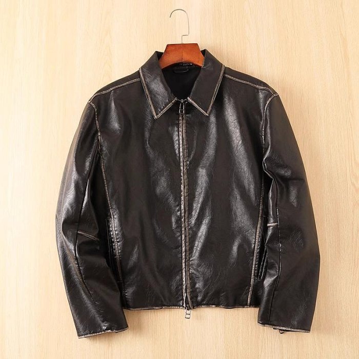 優寶購物《ubao.Tw》特貨品商城,黑貓宅配,取貨付款,=86號店=預購西班牙 質感做舊水洗仿皮革面料 描金燙邊設計 簡單大方 男皮衣外套 如圖色 | Yahoo拍賣
