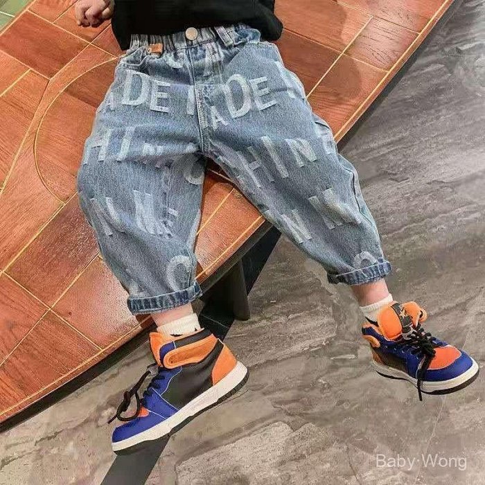 優寶購物《ubao.Tw》特貨品商城,黑貓宅配,取貨付款,[]Baby·Wong男童字母滿印牛仔褲春秋新款中大童寬鬆長褲兒童帥氣褲子男 | Yahoo拍賣