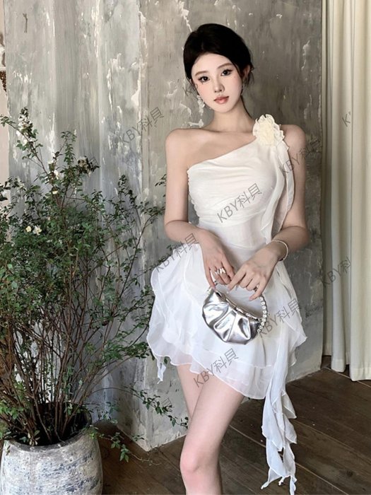 優寶購物《ubao.Tw》特貨品商城,黑貓宅配,取貨付款,性感法式純欲白色斜肩雪紡連衣裙仙女夏季高級感生日小禮服公主裙【KBY科貝】 | Yahoo拍賣