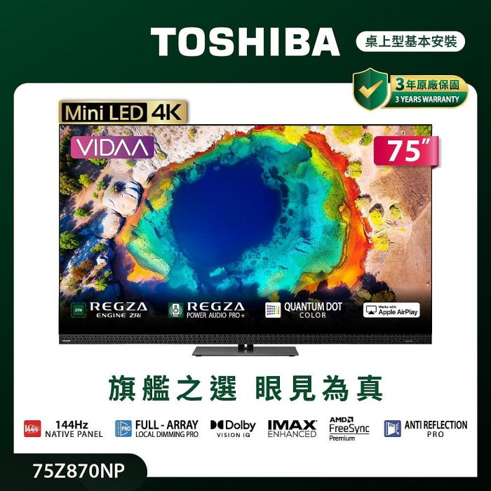 優寶購物《ubao.Tw》特貨品商城,黑貓宅配,取貨付款,TOSHIBA 東芝 REGZA 75型4K 144Hz QD Mini LED VIDAA AirPlay2 智慧顯示器 75Z870NP | Yahoo拍賣