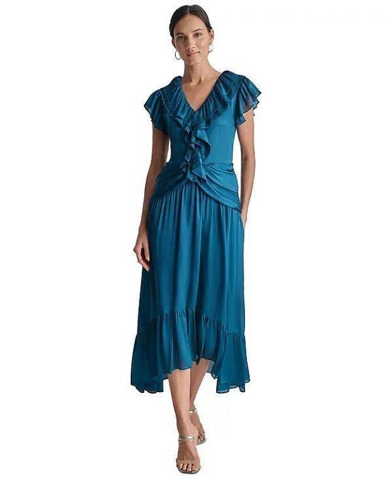 優寶購物《ubao.Tw》特貨品商城,黑貓宅配,取貨付款,139美元 DKNY 孔雀藍 荷葉邊V領大襬洋裝 850元 | Yahoo拍賣