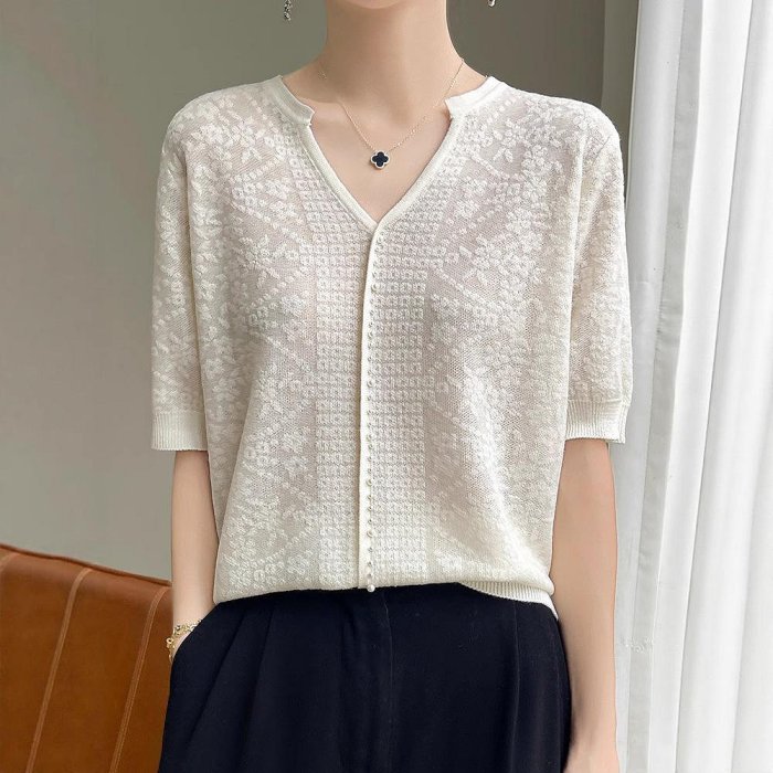 優寶購物《ubao.Tw》特貨品商城,黑貓宅配,取貨付款,2025夏季新款天絲女休閑百搭短袖T恤V設計時尚百搭鏤空鉤花上衣 | Yahoo拍賣
