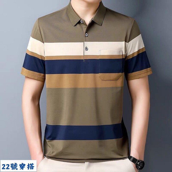 優寶購物《ubao.Tw》特貨品商城,黑貓宅配,取貨付款,短袖T恤中老年男士翻領有口袋POLO衫 爸爸夏上衣爺爺條紋中年男裝-22號穿搭 | Yahoo拍賣