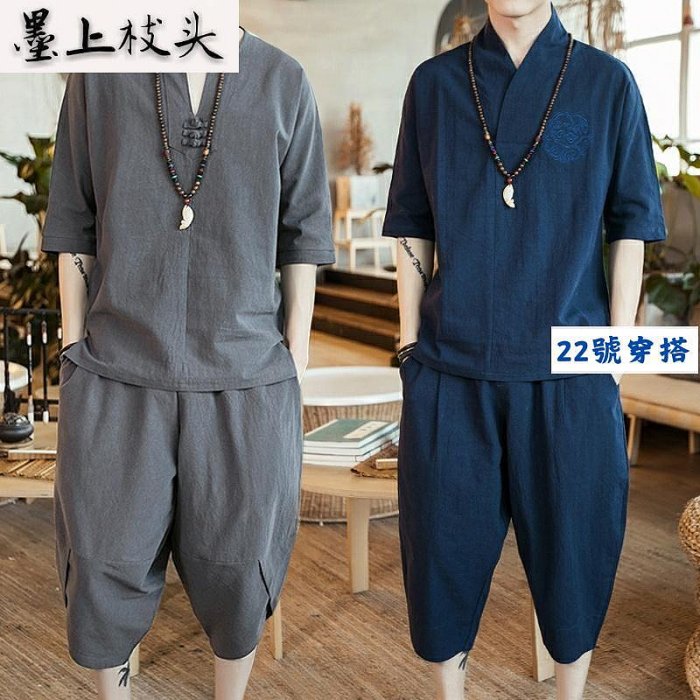 優寶購物《ubao.Tw》特貨品商城,黑貓宅配,取貨付款,新款夏季亞麻套裝男中國風恤短袖兩件套大尺碼寬鬆七分褲套裝男-22號穿搭 | Yahoo拍賣