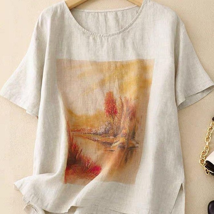 優寶購物《ubao.Tw》特貨品商城,黑貓宅配,取貨付款,大碼棉麻 舒適 洋裝***復古印花棉麻圓領薄款短袖大碼T恤夏季寬松顯瘦上衣亞麻小衫 | Yahoo拍賣
