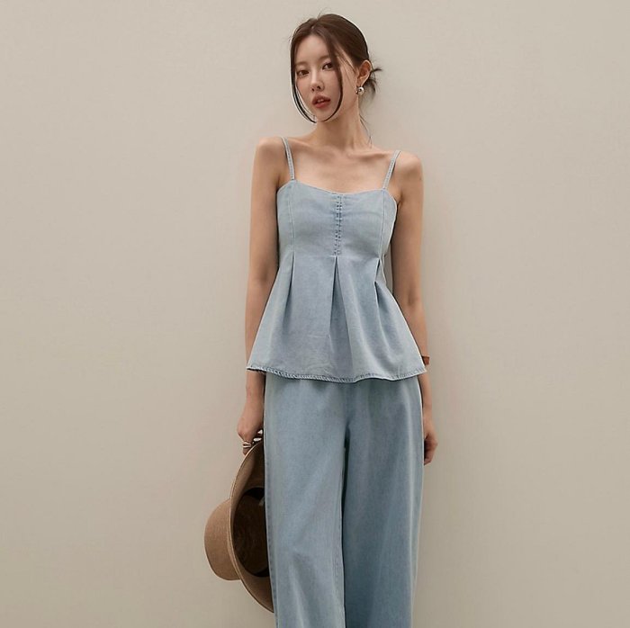 優寶購物《ubao.Tw》特貨品商城,黑貓宅配,取貨付款,正韓代購 DB.85278 細肩彈性吊帶+寬褲水洗牛仔褲套裝 25JUL | Yahoo拍賣