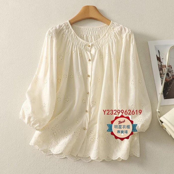 優寶購物《ubao.Tw》特貨品商城,黑貓宅配,取貨付款,明星衣櫃=·文藝鏤空刺繡精致單排扣襯衫慵懶范兒棉麻七分袖上衣女開衫純色 | Yahoo拍賣
