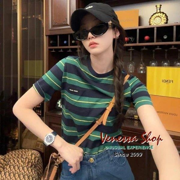 優寶購物《ubao.Tw》特貨品商城,黑貓宅配,取貨付款,小V特賣館~ 義大利少女 MMU 活力配色 女のmiu藍綠色織條紋T恤上衣 (U2013) | Yahoo拍賣