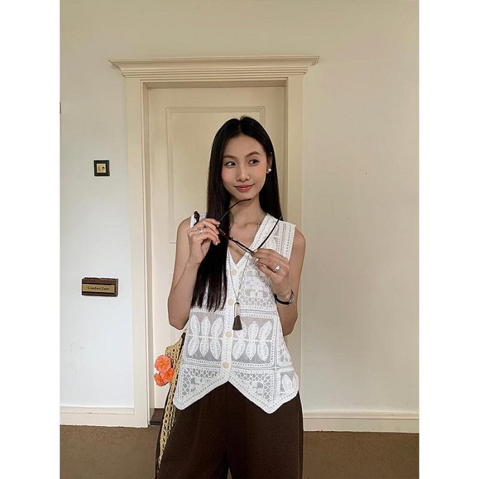 優寶購物《ubao.Tw》特貨品商城,黑貓宅配,取貨付款,愛西里2025夏季氣質慵懶風鉤花鏤空單排扣馬甲背心無袖上衣15093 | Yahoo拍賣