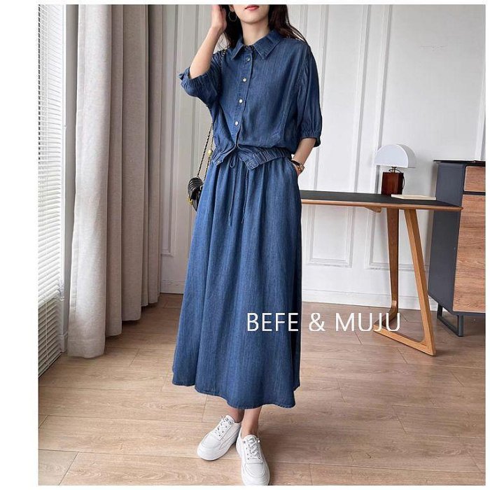 優寶購物《ubao.Tw》特貨品商城,黑貓宅配,取貨付款,BEFE時尚精品 夏季翻領 薄款天絲牛仔襯衫上衣+半身裙 可拆買 B07251 | Yahoo拍賣