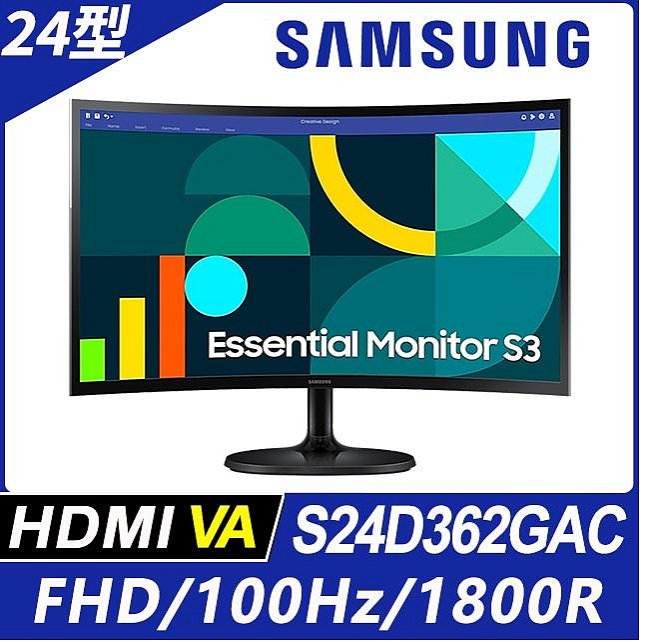 優寶購物《ubao.Tw》特貨品商城,黑貓宅配,取貨付款,Samsung 三星 S24D362GAC 曲面萊茵護眼低藍100Hz飆速螢幕(24吋/100Hz/FHD/1800R/HDMI+Dub/VA) 液晶螢幕 | Yahoo拍賣