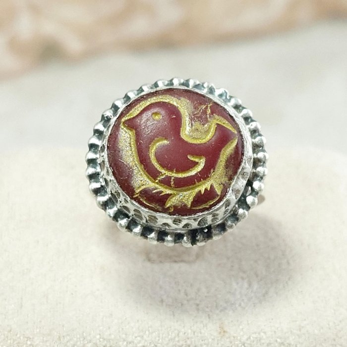 優寶購物《ubao.Tw》特貨品商城,黑貓宅配,取貨付款,【善觀手作精品】戒指 捷克琉璃珠 復古小鳥 紅描金 925銀飾 手工 銀戒 活動戒圍 飾品 首飾 | Yahoo拍賣