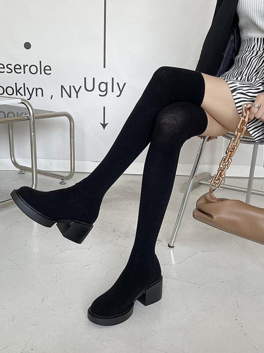 優寶購物《ubao.Tw》特貨品商城,黑貓宅配,取貨付款,新上架2025款黑色過膝彈力襪靴女春秋季新款顯瘦百搭仙女風粗跟針織長筒靴 | Yahoo拍賣