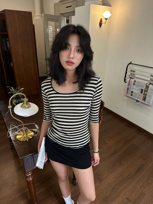 優寶購物《ubao.Tw》特貨品商城,黑貓宅配,取貨付款,My fit guys 推薦 百搭 韓款 天絲 GOGO 條紋 短袖上衣 圓領T恤 修身 五分袖 中袖 黑 預購 | Yahoo拍賣