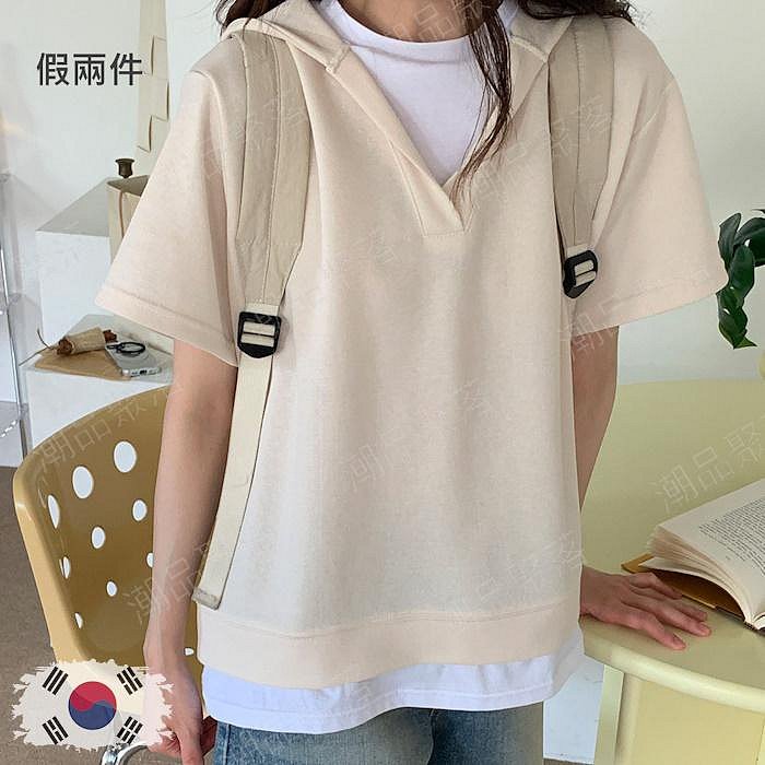 優寶購物《ubao.Tw》特貨品商城,黑貓宅配,取貨付款,正韓🇰🇷BY. GRIM正品 春夏韓國女裝 假兩件連帽衫 撞色連帽短袖T恤[BG250807-5]~潮品聚落 | Yahoo拍賣