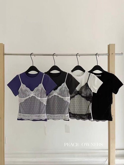 優寶購物《ubao.Tw》特貨品商城,黑貓宅配,取貨付款,假兩件蕾絲拼接高彈性短袖T恤 | Yahoo拍賣