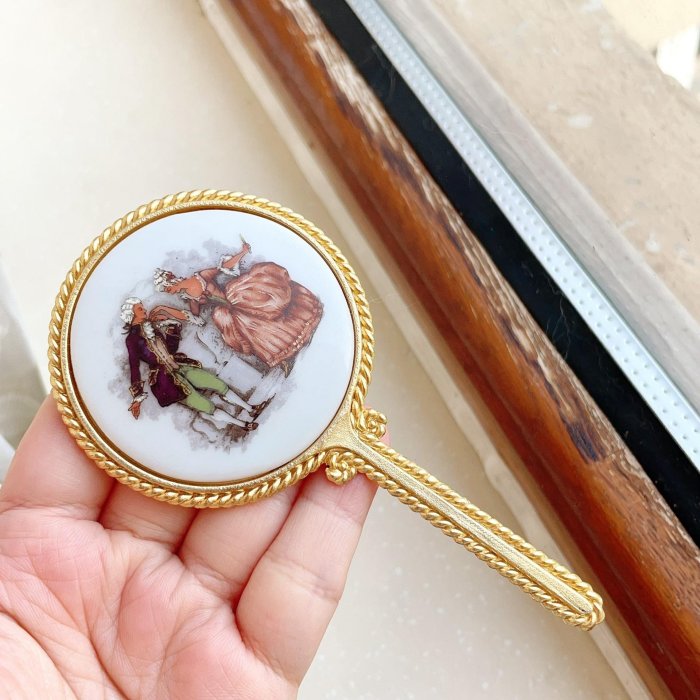 優寶購物《ubao.Tw》特貨品商城,黑貓宅配,取貨付款,嚴選vintage利摩日陶瓷化妝鏡,金色麻繩紋手柄搭配白色彩繪復古情侶設計, Condition: 良好,附原盒。化妝鏡、復古、利摩日陶瓷 | Yahoo拍賣