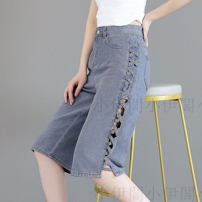 優寶購物《ubao.Tw》特貨品商城,黑貓宅配,取貨付款,小伊閣=藍色高腰牛仔褲夏季薄款版闊設計新款側邊寬松鏤空筒褲小眾七分褲 | Yahoo拍賣