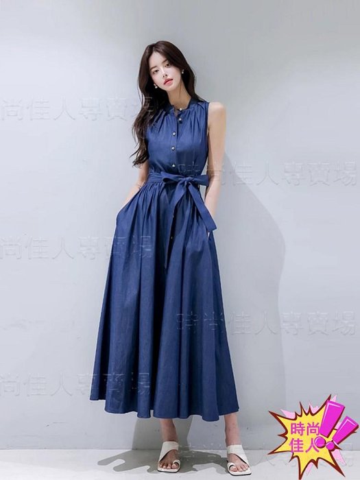 優寶購物《ubao.Tw》特貨品商城,黑貓宅配,取貨付款,時尚佳人=立領天絲牛仔背心連衣裙女夏季復古優雅單排扣收腰大擺長裙 | Yahoo拍賣