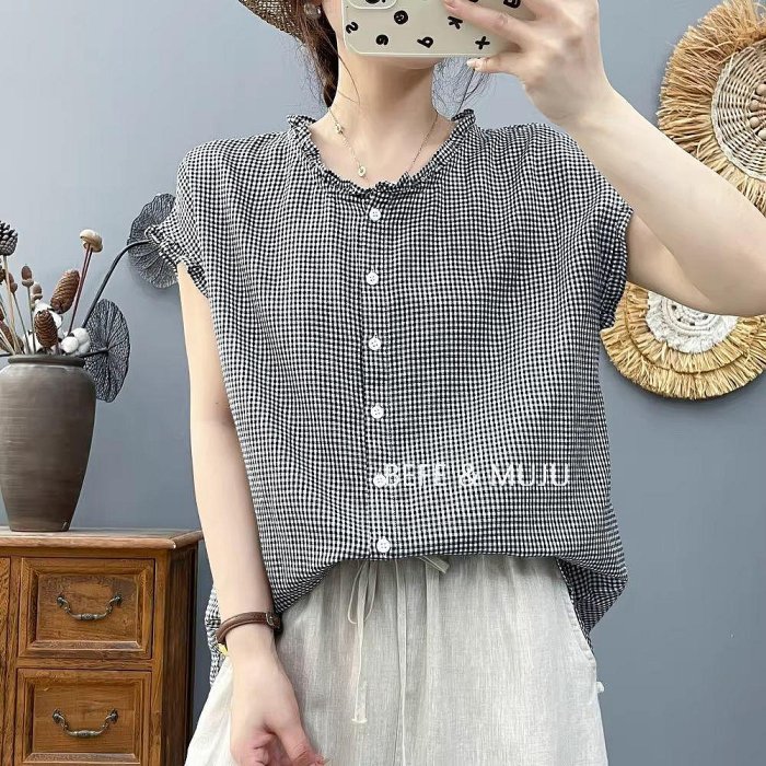 優寶購物《ubao.Tw》特貨品商城,黑貓宅配,取貨付款,BEFE時尚精品 氣質格紋 蕾絲領雙層棉紗 小飛袖襯衫 B08174 | Yahoo拍賣