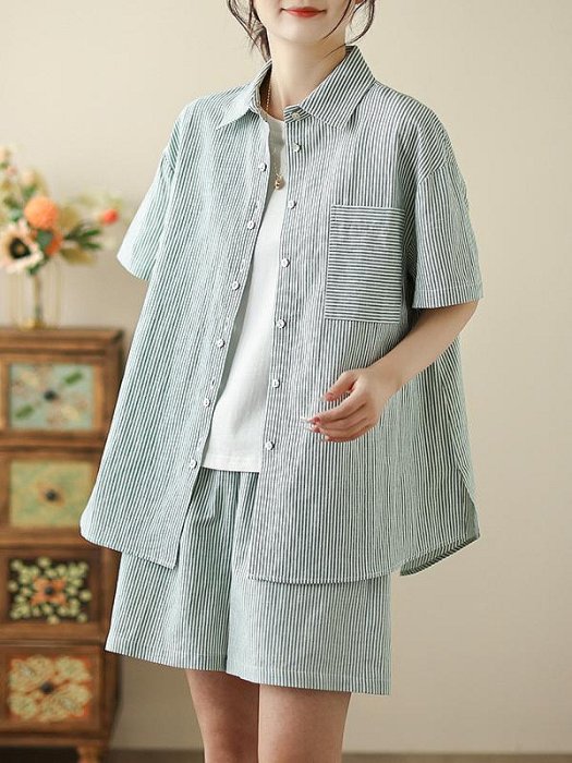 優寶購物《ubao.Tw》特貨品商城,黑貓宅配,取貨付款,棉麻條紋時尚套裝短袖排扣翻領襯衫松緊腰闊腿短褲休閑寬松兩件套 | Yahoo拍賣