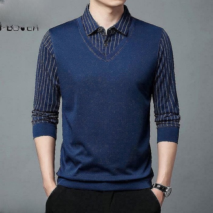 優寶購物《ubao.Tw》特貨品商城,黑貓宅配,取貨付款,潮人 春秋薄款 翻領假兩件 POLO男長袖T恤 條紋印花 中爸爸裝- | Yahoo拍賣