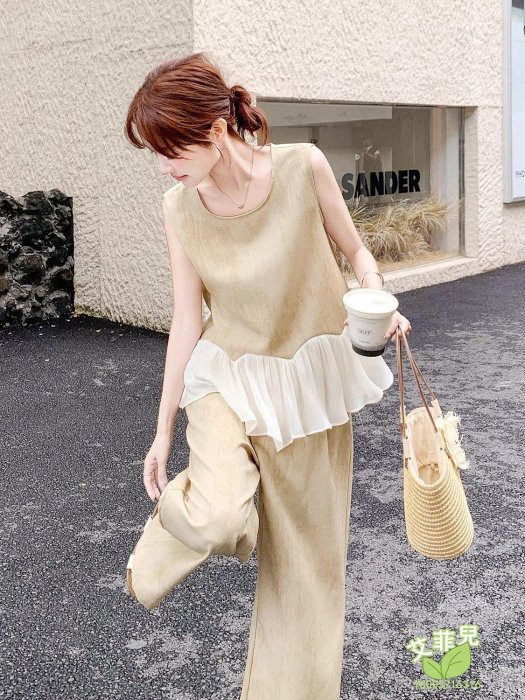 優寶購物《ubao.Tw》特貨品商城,黑貓宅配,取貨付款,艾菲兒=韓版時尚25新款薄紗荷葉邊拼接上衣闊腿褲套裝夏日休閑通勤一整套 | Yahoo拍賣