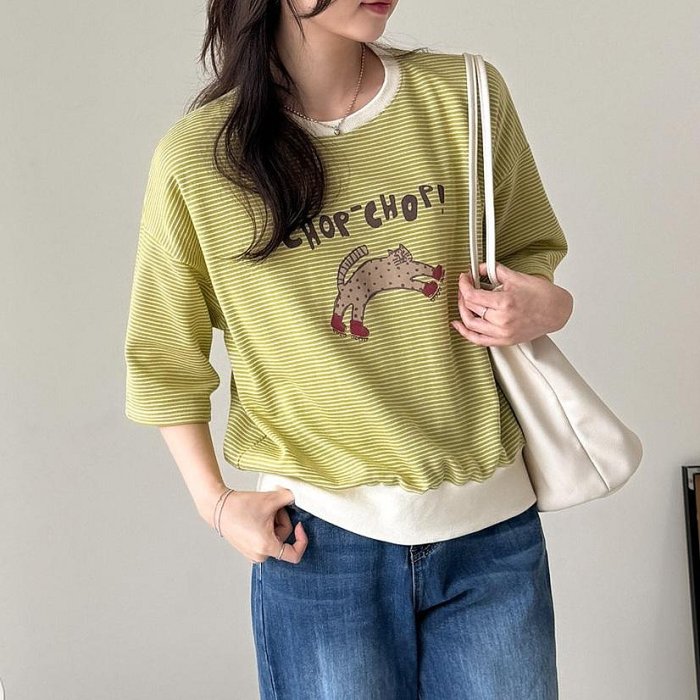 優寶購物《ubao.Tw》特貨品商城,黑貓宅配,取貨付款,Forever Kids 正韓 遮手臂休閒條紋 可愛印花T上衣【A69365】韓國代購 | Yahoo拍賣