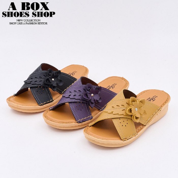 優寶購物《ubao.Tw》特貨品商城,黑貓宅配,取貨付款,格子舖*【AN561T】MIT台灣製 跟高3cm 花朵裝飾交叉粗帶拖鞋 皮質鞋面 圓頭楔型懶人鞋 3色 | Yahoo拍賣