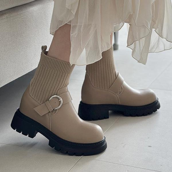 優寶購物《ubao.Tw》特貨品商城,黑貓宅配,取貨付款,DG韓系鞋坊-正韓 韓國空運 牛皮✨拼接針織布直套式粗跟短靴 馬丁靴 止滑 厚底顯瘦【25F0027】現貨+預購 | Yahoo拍賣